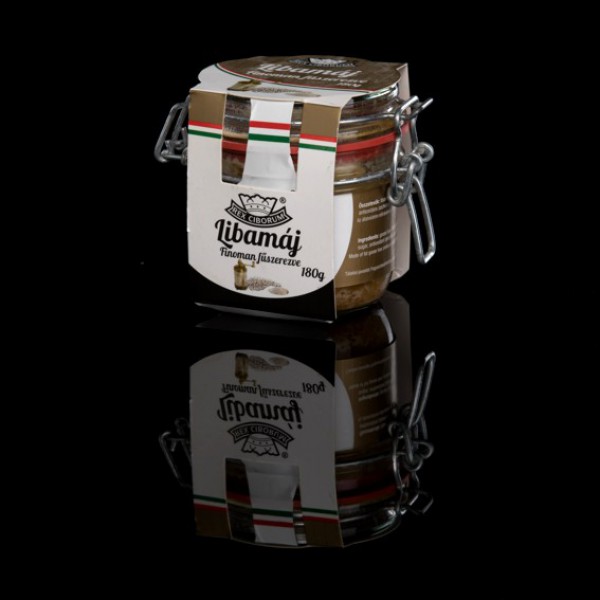Minőségi hízott libamáj fehérborssal és sóval enyhén fűszerezve, csatos üvegbe zárva.